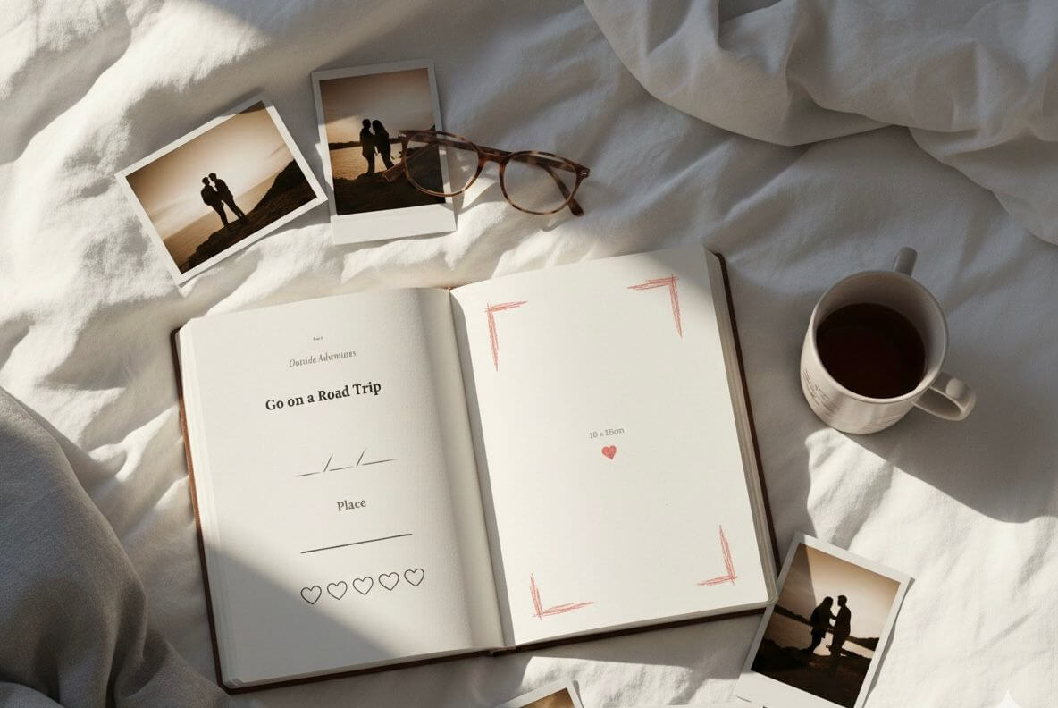 From at home dates, to exploring new activities together. The couples edition is seperated into 4 parts, Outside adventures, unique events, At-home cozy moments, growth and connection, and playful dates.